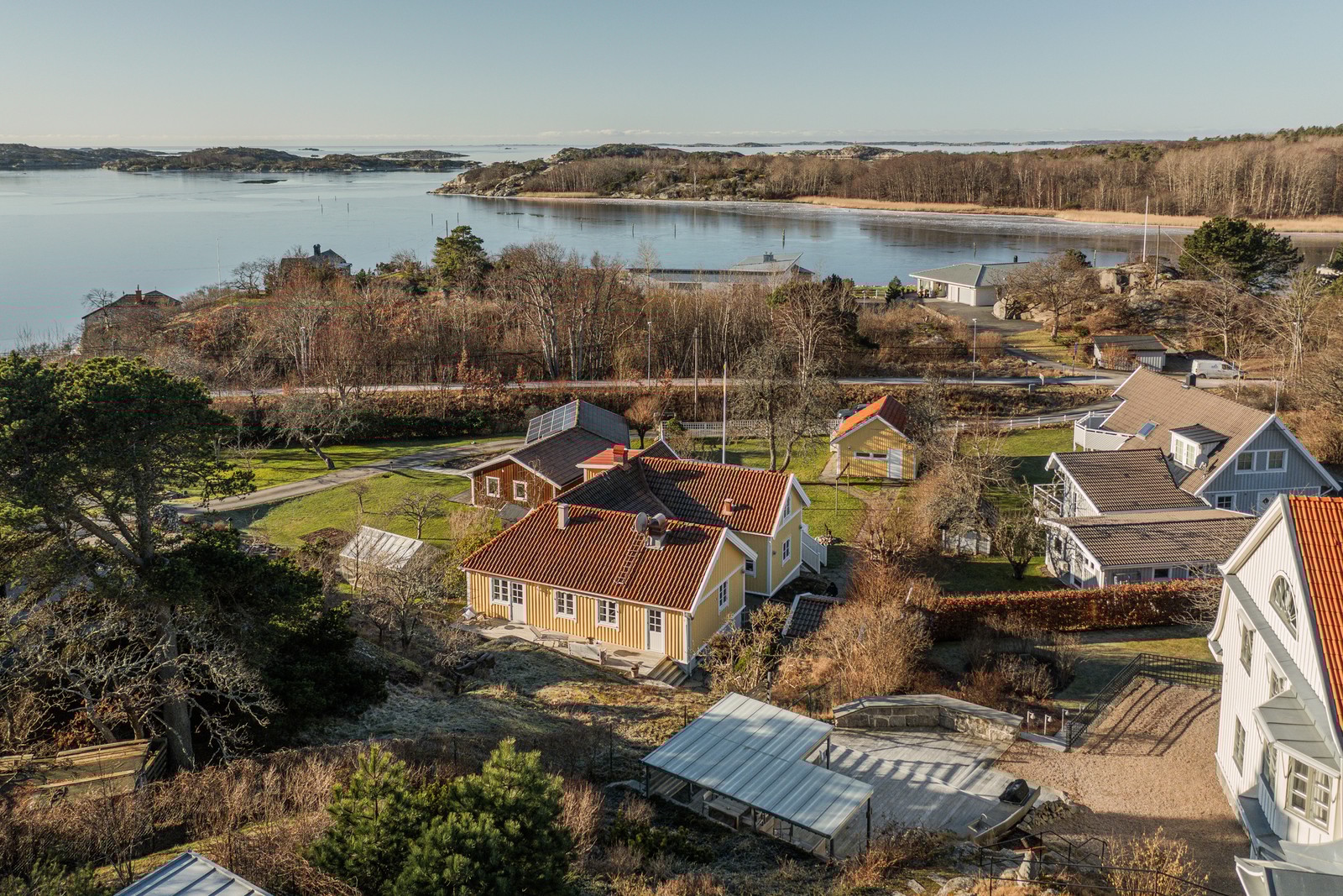 Ett stycke utmed den gamla Säröbanans cykelväg och endast ca 100 meter från kustlinjen ligger den stora och uppväxta trädgården om ca 1 458 kvm med en väl tilltagen plan gräsmatta samt bergstomt öster om huset. Den rymliga skärgårdsvillan har en bruksarea om ca 265 kvm + dubbelgarage och friggebod. De nio ljusa rummen ligger långt in på tomten som är omfamnad av vita spjälstaket och skyddande grönska. I solnedgången silas kvällsljuset genom trädgårdens grenverk. Det fria västerläget ger ofta en rosa kvällshimmel över grönskan. Vid det rymliga garaget så nås en lång skiffergång som korsar de kortklippta gräsytorna och leder fram till en skiffersatt uteplats vid entrén.