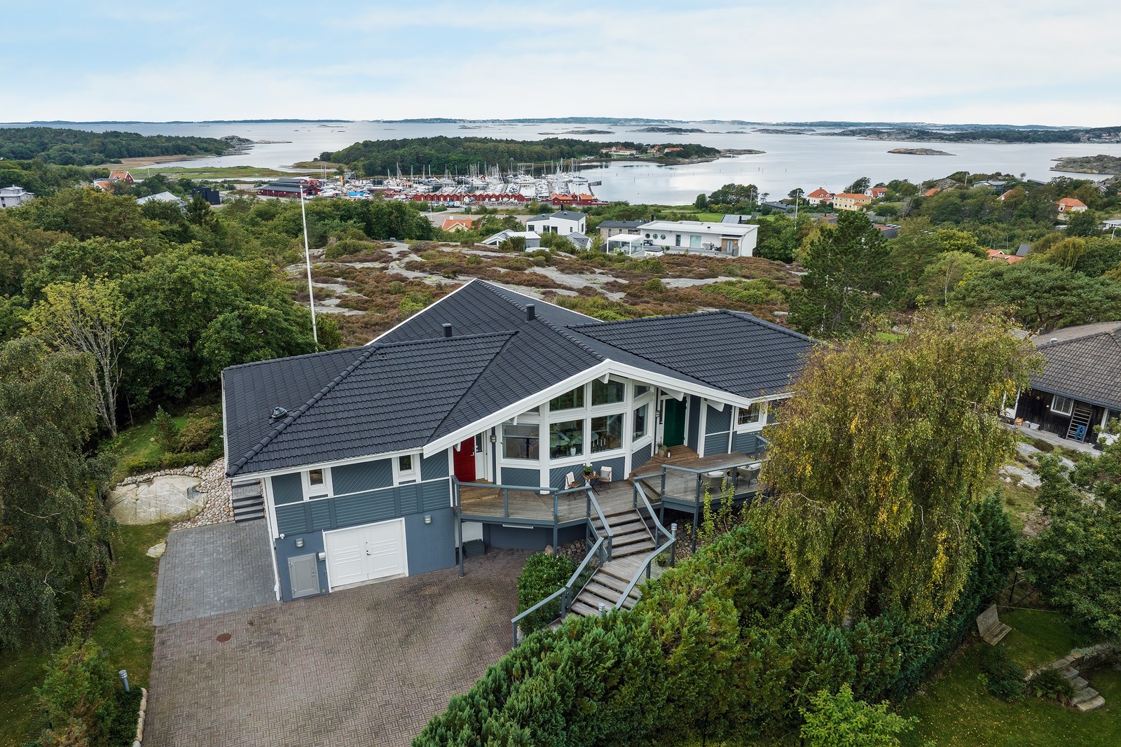 Ljus villa på högt och naturnära läge med svårslagen fri utsikt över hamn, hav och horisont
