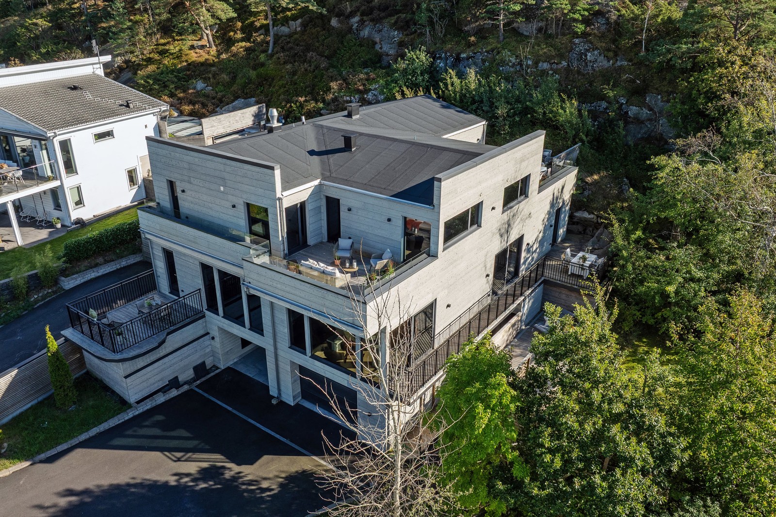 Den privata uppfarten är asfalterad och kantad av ljusa stenar. Ner till höger finns en stor yta framför garaget och entrén till sluttningsplanet. Till vänster fortsätter uppfarten upp mot huvudentrén. En svagt sluttande trappa i asfalt och sten går parallellt och slutar vid en trätrappa upp till trädäcket som löper runt villans hörn.
