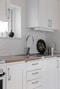 Direkt till vänster om hallen ligger bostadens trevliga kök. Köket är stilrent utformat i praktisk och klassisk stil. Vita skåpsluckor samsas smakfullt med vitt kakel som löper ovan bänkskivan. Goda förvaringsutrymmen för kökets porslin och alla redskap samt praktiska ytor för bak- och matbestyr. Den maskinella utrustningen består av kombinerad kyl/ frys, ugn med spis, fläkt samt diskmaskin.
