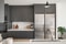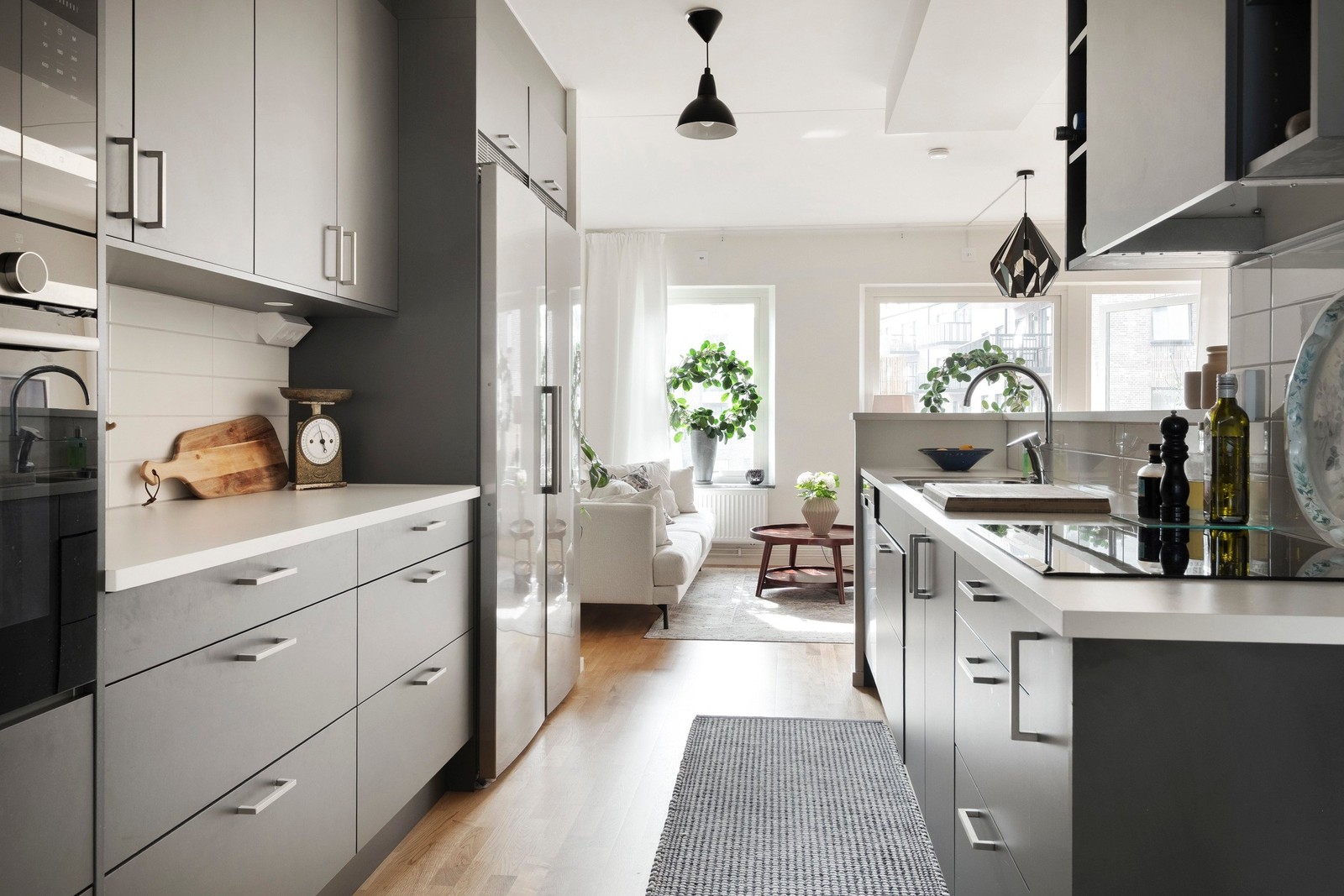 Klassiskt och tidlöst kök signerat Marbodal som erbjuder goda förvaringsmöjligheter samt fina arbetsytor. Skåpsinredning och luckor är stilrent mörkgråa, här finns allt man kan önska i maskinell utrustning. Rostfria vitvaror såsom ugn och micro i bekväm arbetshöjd, kyl & frys i fullhöjd, induktionshäll, diskmaskin. Det finns även fläkt och ovan arbetsytan finns kakel samt god punktbelysning. En bänksskiva i laminat blir en snygg kontrast mot det i övrigt mörka köket. Matplatsen, med plats för 4–8 personer, får sin naturliga plats invid köksdelen.