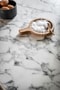 Redan i hallen möts du av en känsla av rymd och exklusivitet. Här finns gott om plats för avhängning av ytterkläder och skor, samt goda förvaringsmöjligheter i form av en skjutdörrsgarderob med spegeldörrar direkt till vänster om entrén. Genomtänkta materialval och sobra färger sätter tonen för resten av bostaden.
