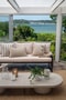 De dubbla altandörrarna står öppna ut mot havsdoft och fågelkvitter. Härute finns en liten veranda under tak med traditionellt träräcke i vitt. Till vänster, bakom skjutbara glaspartier, ligger villans orangeri. Det är skjutbara glaspartier runt om – som ett brett burspråk. Vågorna slår mot stranden, ca 70 meter nedanför tomten och på andra sidan syns Näset bortom Askims långa badbrygga. Härinne kan både midsommarens och kräftskivans snapsvisor klinga ut över vattnet. Samtidigt förlängs säsongen en bra bit in på hösten.