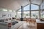 Till vänster i den inre hallen öppnar sig de stora och ljusa sällskapsytorna i öppen planlösning med kök. En blond trestavsparkett i ek sträcker ut under det svagt sluttande paneltaket, öppet upp till den höga nocken. Den breda gavelväggen är helt täckt av glaspartier som följer med ända upp till nock – den spektakulära utsikten över viken presenterar sig. Under takfoten till vänster radar högt placerade, långsmala glaspartier upp sig och ger ljus från ytterligare ett väderstreck. Det stora rummet har en tidlös skandinavisk ton med rena och enkla arkitekturlinjer. Rumsvolymen är påtaglig och transparensen mot himmel, ljus och hav bidrar till känslan av rymd och yta. Den blonda interiören får kontrast av den lilla traditionella järnkaminen med hög rökkanal i svart. Invid köksdelen finns plats för långbord med havsutsikt.