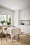 Genomgående kvalitativa materialval i form av parkettgolv i ek och slätmålade väggar som ger en neutral bas att inreda efter.