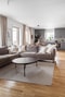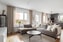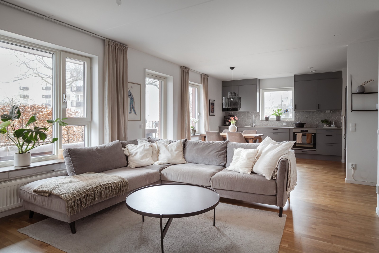 Ljust och luftigt vardagsrum med generösa sällskapsytor. Den öppna planlösningen mot köket skapar en social och inbjudande atmosfär. Stora fönsterpartier ger ett fint ljusinsläpp och här finns gott om plats för både soffgrupp, TV-möbel och övrig möblering.