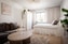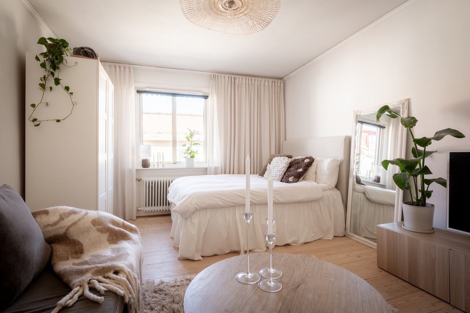 Bostadens rum som är beläget på andra sidan bostaden, ger en luftig känsla tack vare återkommande ljusa ytskikt och stort fönster. Här finner du gott om yta för socialt umgänge. En soffgrupp med tillhörande möblemang och förvaring eller läshörna ryms med lätthet i ena delen av det kvadratiska rummet. På andra sidan får sängen sin naturliga plats. Förvaringen får sin plats i två, höga garderober samt i det rymliga förrådet som hör bostaden till.