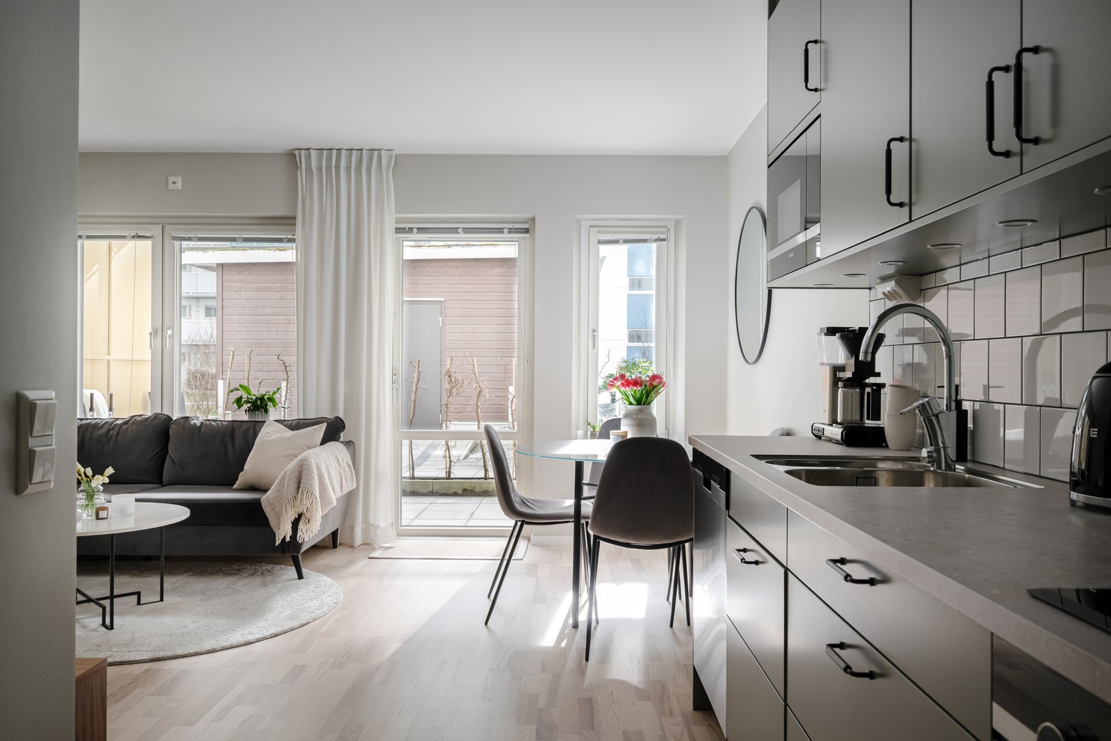 Vidare in till kök och vardagsrum som möts i en öppen planlösning. Det stilsäkra Marbodalköket består av inbyggd mikro och induktionshäll för bästa komfort och diskmaskin i fullstorlek. Möblera med ett matbord för 2-4 personer. Från köket når du bostadens stora uteplats beläget mot innergården. Vardagsrumsdelen erbjuder en öppen planlösning mot köket. Här erbjuds plats för soffa och tillhörande möblemang. I vardagsrummet erbjuds även plats för en större säng.