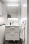 Det stora badrummet är helkaklat och fräscht. Stilrent med vitt kakel på väggarna och grå klinkers på golvet. Här finns en rymlig duschhörna, wc, handfat med praktisk kommod för förvaring samt spegel med belysning. I badrummet finns även en alldeles egen kombinerad tvättmaskin och torktumlare. Praktiskt och bekvämt! Inredningen kommer från kvalitetssäkra Vedum.