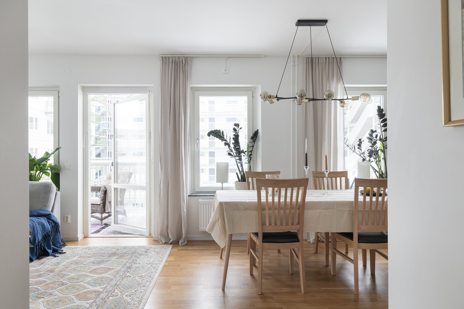 Vardagsrummet har en otrolig rymd, här får ni plats med både soffgrupp och matsalsmöbler. Soffan får sin naturliga plats invid det stora fönsterpartiet. Härifrån nås bostadens rymliga balkong som skapar en härlig oas där sommaren kan spenderas med blicken över innergården. Underbart söderläge, därmed en underbar plats att spendera långa sommardagar på! Föreningen har även nyligen godkänt inglasning av balkong om man vill bruka den året om!