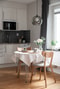 Vidare in i lägenheten når du bostadens kök och sociala ytor. Köket är stilrent i en tidlös utformning och smälter samman med det övriga hemmet. Köksskåp och kakel smälter samman i en vit kulör och bryts av via en mörk bänkskiva. Praktiskt utformat med bra arbetsytor och mycket förvaring. Utrustningen består av häll, ugn, fläkt, diskmaskin, mikro samt kyl/frys. Mellan kök och vardagsrum får ett större matbord plats.