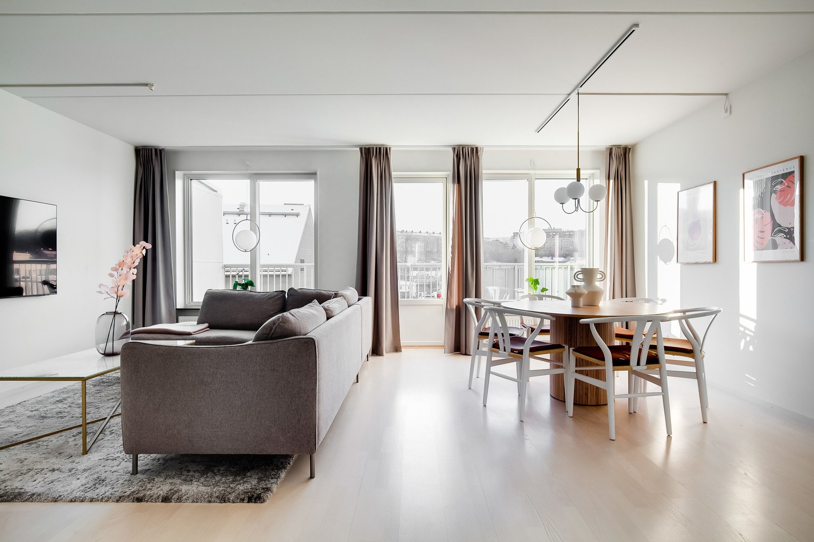 Matsalsbordet har en naturlig plats framför fönsterpartiet. Här finns gott om utrymme för middagsbjudningar. Möblera vardagsrumdelen med en stor, mysig soffa för långa filmkvällar eller en soffgrupp att samlas i med familj och vänner. I de stora fönsterpartierna kan vackra föremål smycka fönsterbrädet i sten.
