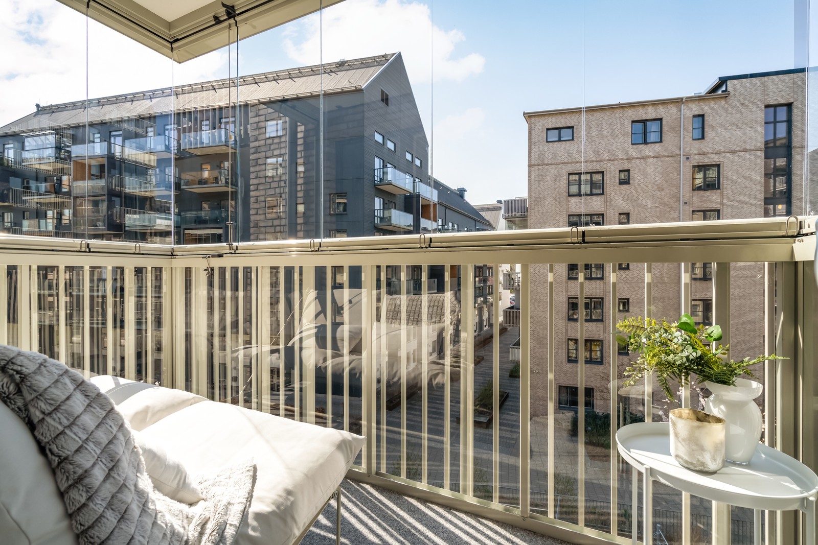 Från vardagsrummet når du bostadens inglasade balkong. Tack vare västerläget kan du njuta av eftermiddagssolen med goda vänners lag.