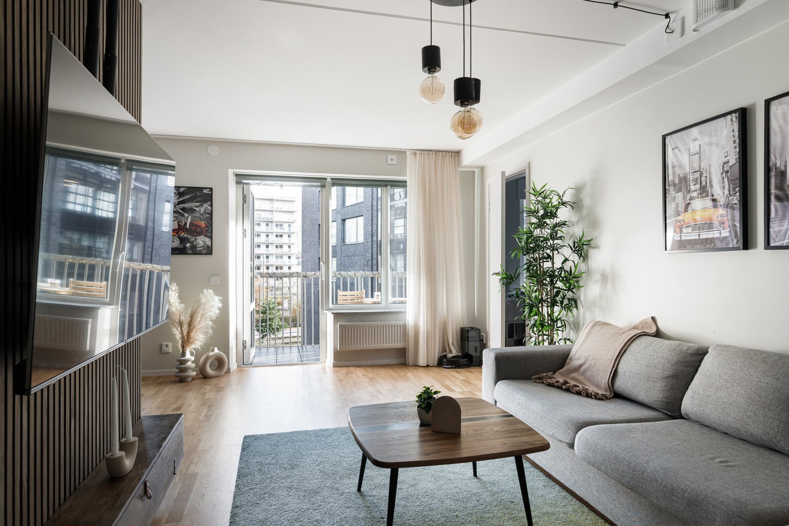 Häpnas av det ljus som berikar hemmet via stora, härliga fönsterpartier. En öppen planlösning mellan kök och vardagsrum skapar ett hem att leva i med familj och vänner i fokus. Skapa matmagi i det ljusa köket från Marbodal samtidigt som du umgås med gästerna i soffgruppen i vardagsrumsdelen. De mörka luckorna möter en vacker köksbänk och skapar en kontrast skön för ögat. Induktionshäll och kyl och frys i full höjd passar sig väl för den matglade familjen. Integrerad ugn, mikrovågsugn och diskmaskin skapar en enhetlig känsla i det smakfulla köket. Vitvarorna är märkta Siemens, god kvalité! Från vardagsrummet når du bostadens balkong där ljuset flödar in.