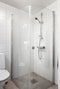 Till väster i hallen finns hemmets andra badrum med noga utvalda material och tidlös färgsättning. I ett av hörnen finns en dusch med väggar i klarglas. Badrummet har en WC-stol, en vit kommod samt överhängande spegel med belysning.
