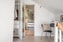 Kliv in och möts av en inbjudande hall med plats för avhängning av ytterkläder. Här ligger praktisk ljusgrå klinker som på ett stilrent sätt markerar entrén. Direkt till höger om entrén sitter en installerad luftvärmepump – en mycket ovanlig och uppskattad detalj i lägenheter som ger både behaglig svalka under sommarens varma dagar och effektiv uppvärmning under årets kallare månader. Vidare in i bostaden tar det vitlaserade furugolvet vid och löper enhetligt genom hemmet tillsammans med vitmålade väggar.