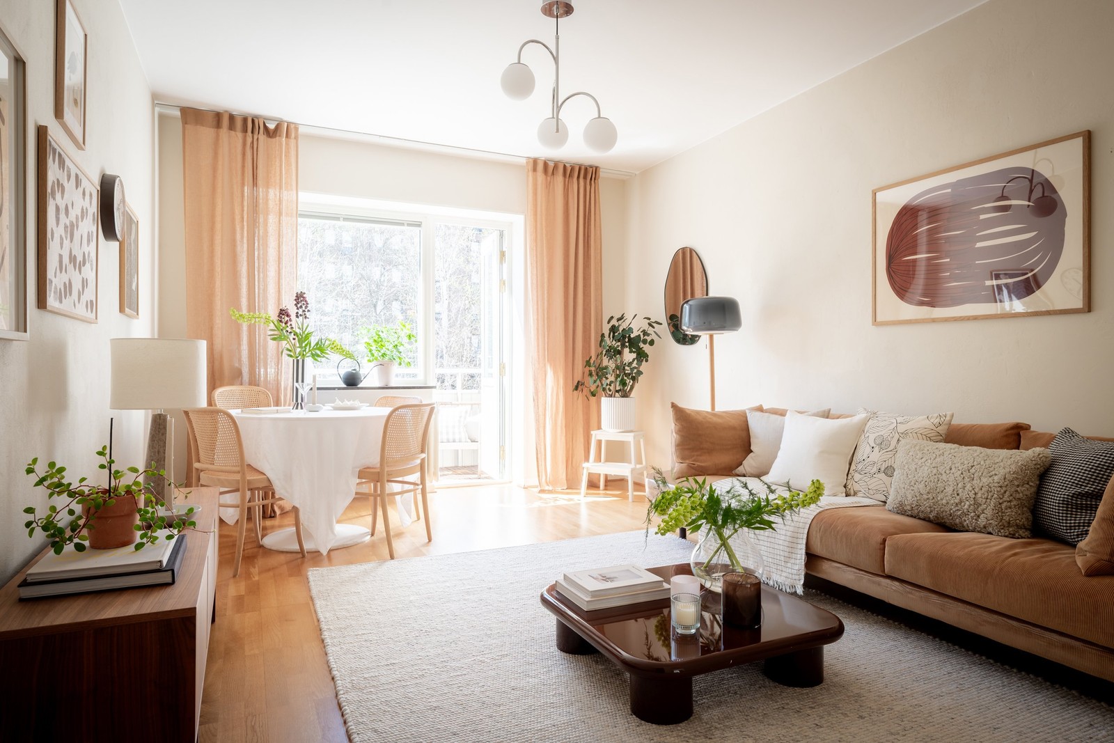 Det rymliga vardagsrummet fungerar som hemmets naturliga samlingspunkt. Här finns gott om plats för en generös soffgrupp och övrig möblering. Från vardagsrummet når du den mysiga balkongen som vetter mot ett lugnt och grönt område, en avkopplande plats som blir ett extra rum under större delen av året.