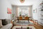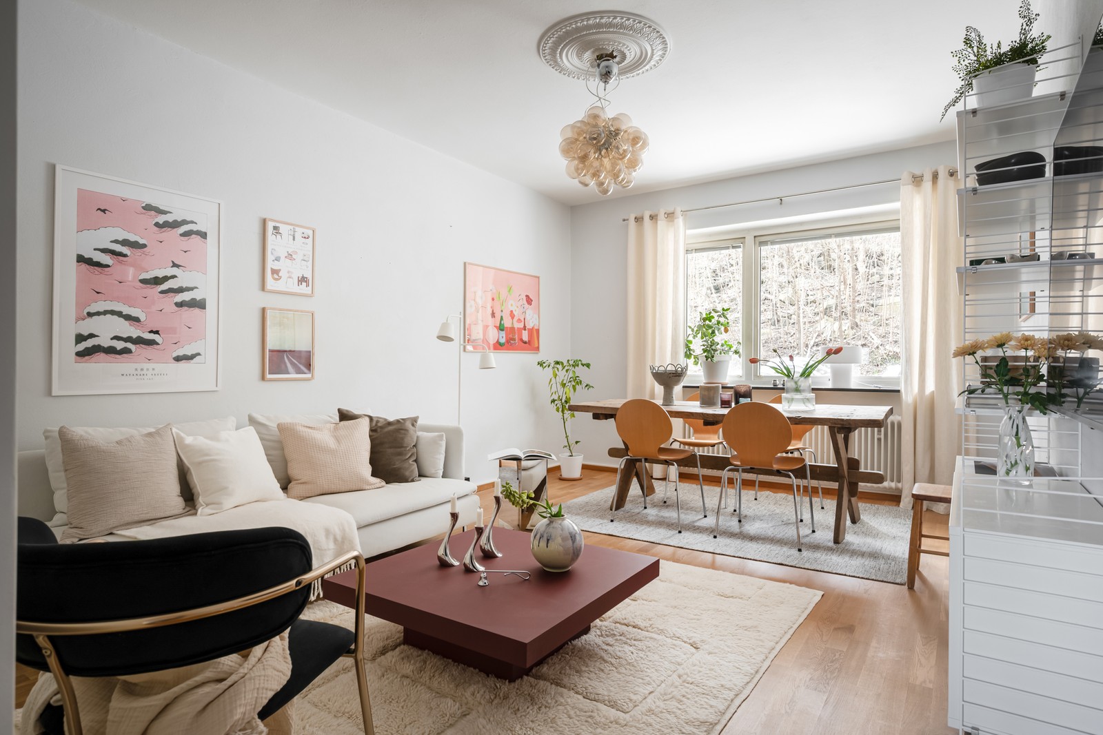 Med sin tidstypiska takhöjd i kombination med ett härligt ljusinsläpp så skapas här ett vardagsrum som både är ljust och luftigt. De rymliga ytorna ger plats åt både en soffgrupp med tillhörande möblemang samt ett matbord för flera personer. För den som önskar finns det även plats för en trevlig skrivbordshörna.