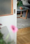 Balkongen rymmer både sittmöbler och växter och ligger lugnt belägen med distans till övriga byggnader. Härifrån bjuds en fin vy mot grönområdet utanför. Balkongen trall är varm och mjuk att stå på.