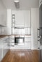 Vidare till höger nås det välplanerade köket. Här erbjuds gott om förvaring i skåp/lådor samt bra arbetsyta vilket ökar matlagningsglädjen. Skåp och luckor är ljusa, köksbänken i mörkare ton och vitt kakel ovanför. Vitvarorna består av kyl, frys, spishäll, ugn, fläkt, diskmaskin (från bosch) och inbyggd mikro.
