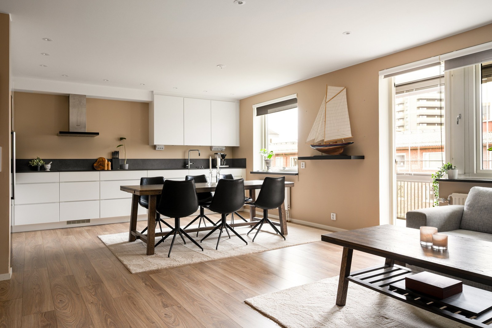 Längre in till vänster öppnas de sociala ytorna upp till en sammanhängande öppen och social planlösning. Vardagsrum och kök blir en naturlig samlingspunkt för trevliga stunder med vänner och familj. De trivsamma färgvalen på väggarna tillsammans med dimbara spotlights i taket skapar en mycket härlig känsla. Köket renoverades stilfullt 2019 med vita skåp/luckor och svart köksbänk. För dig som är duktig i köket finns gott om förvaring och goda arbetsytor. Den maskinella utrustningen består av fläkt, ugn, mikro, spishäll, diskmaskin samt kyl och frys. Vid köksdelen finns utrymme för en stor matgrupp för goda middagar.