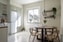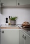 Från hallen nås samtliga rum i bostaden, vilket ger en smidig och genomtänkt planlösning. Vi tar oss vidare in i köket, som även det präglas av ljusa väggar och ett charmigt vitmålat originalplankgolv som ger rummet karaktär. Här finns generöst med plats för ett större matbord där 6–8 personer bekvämt kan samlas, perfekt för både vardagsmiddagar och sociala tillställningar. Köksinredningen går i en mjuk ljusgrön ton med enkla, tidstypiska beslag som förstärker bostadens charm. Arbetsytorna består av en kombination av rostfritt stål och laminat, och ovanför bänkskivan sitter klassiskt vitt kakel som stänkskydd. Köket är utrustat med kombinerad kyl och frys, ugn med spis samt en praktisk kolfilterfläkt.