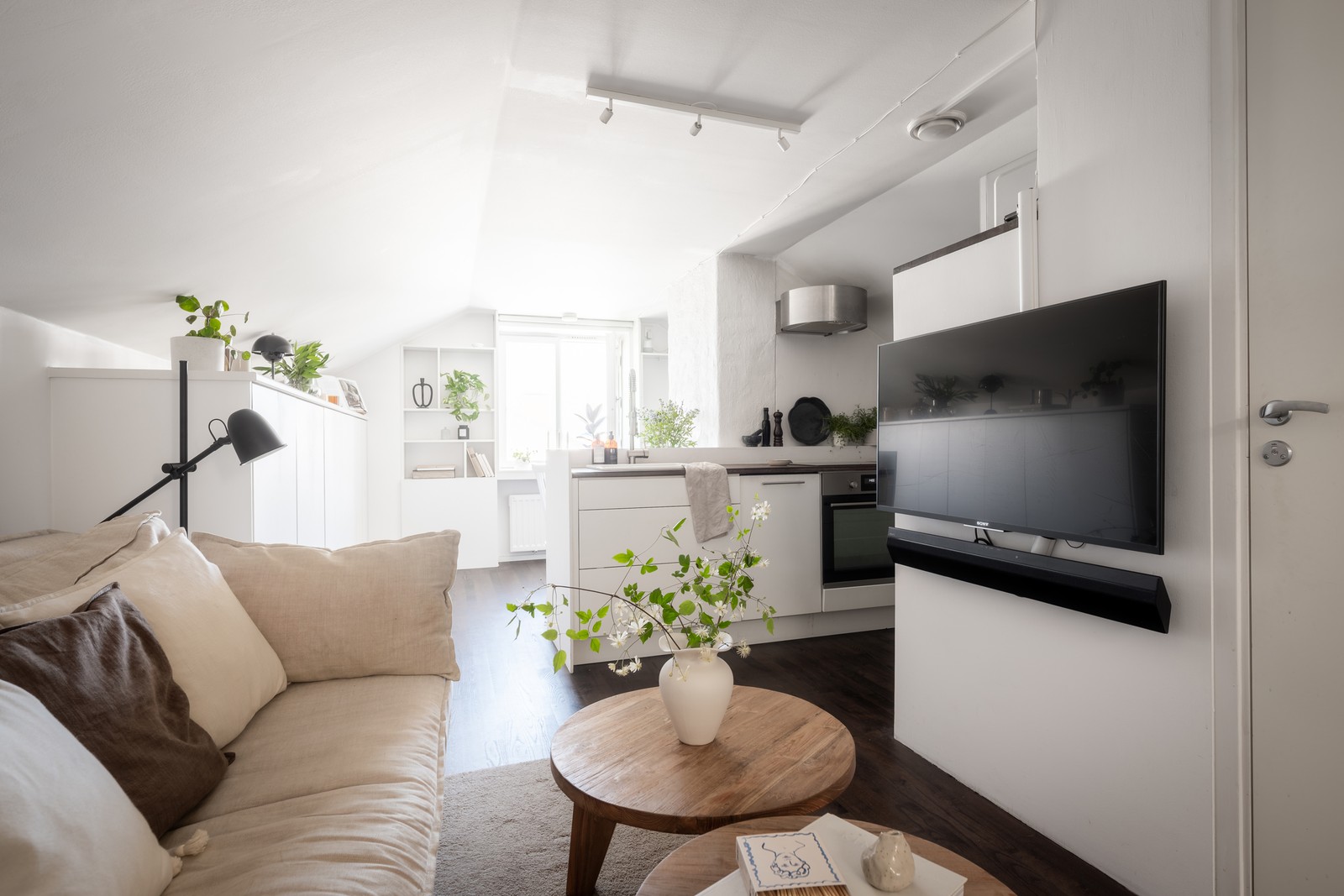 Optimalt planerad etta med stilrent kök och praktisk sovalkov!