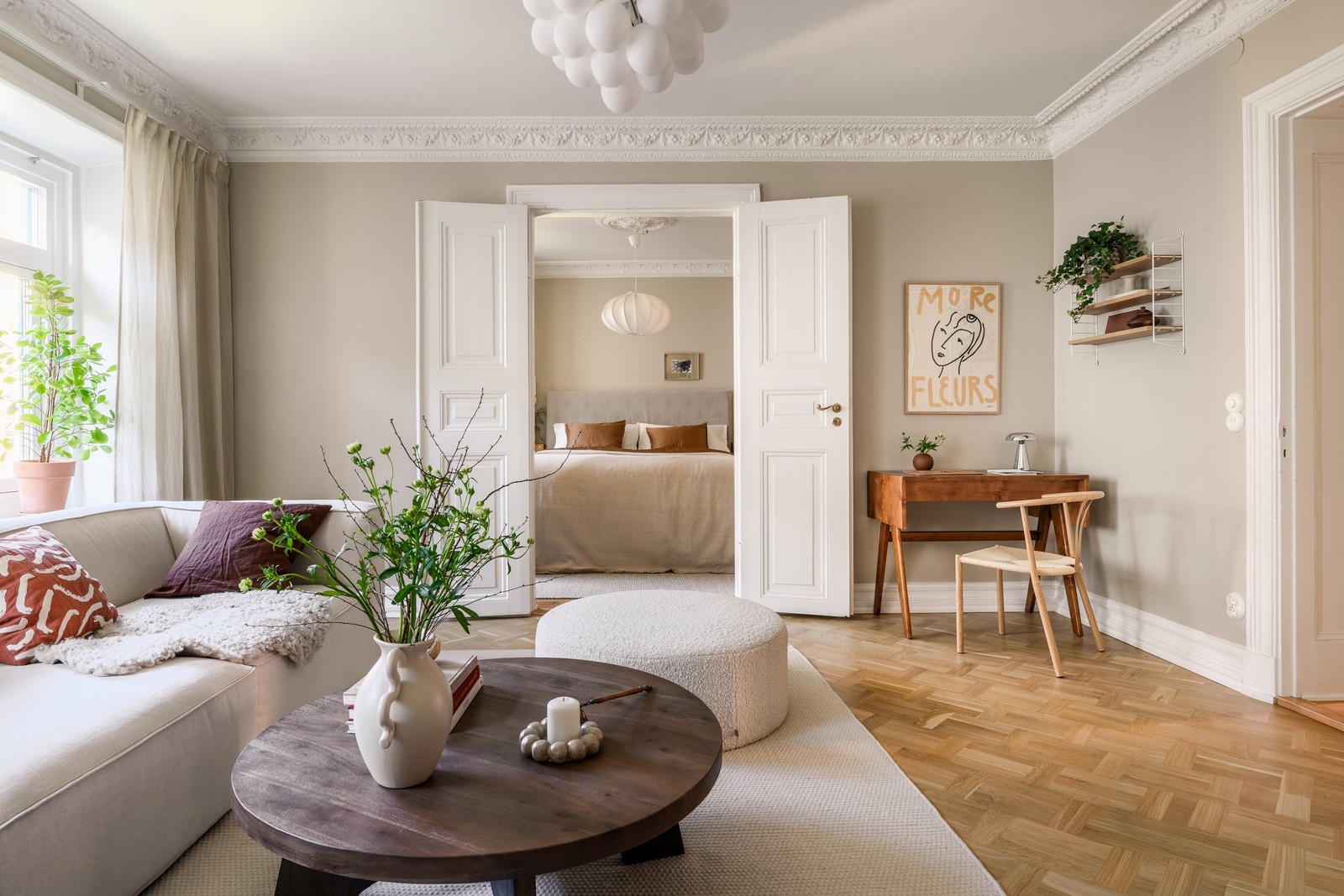 Bostaden präglas av ett generöst ljusinsläpp från stora fönster och vackra originaldetaljer såsom stuckaturer, takrosetter, breda golvlister samt djupa fönster och dörrfoder som ger en tidlös och inbjudande atmosfär. Vardagsrummet binds väl ihop med det eleganta sovrummet genom vackra spegeldörrar.