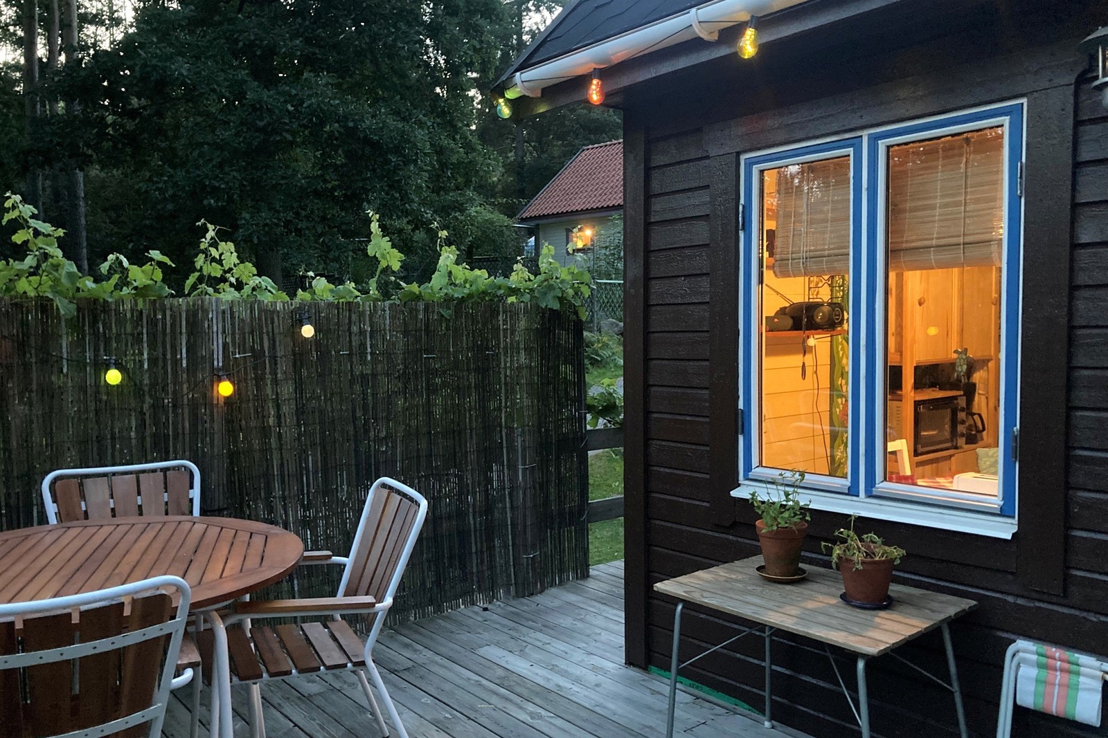 Både trädgård och altan ligger i söderläge och under sommaren omges altanen av prunkande vinrankor som gör den till en insynsskyddad oas. En perfekt yta för avkoppling såväl som för härliga middagar i det gröna. I anslutning till tomten ligger ett lummigt skogsparti som förstärker den naturnära känslan.