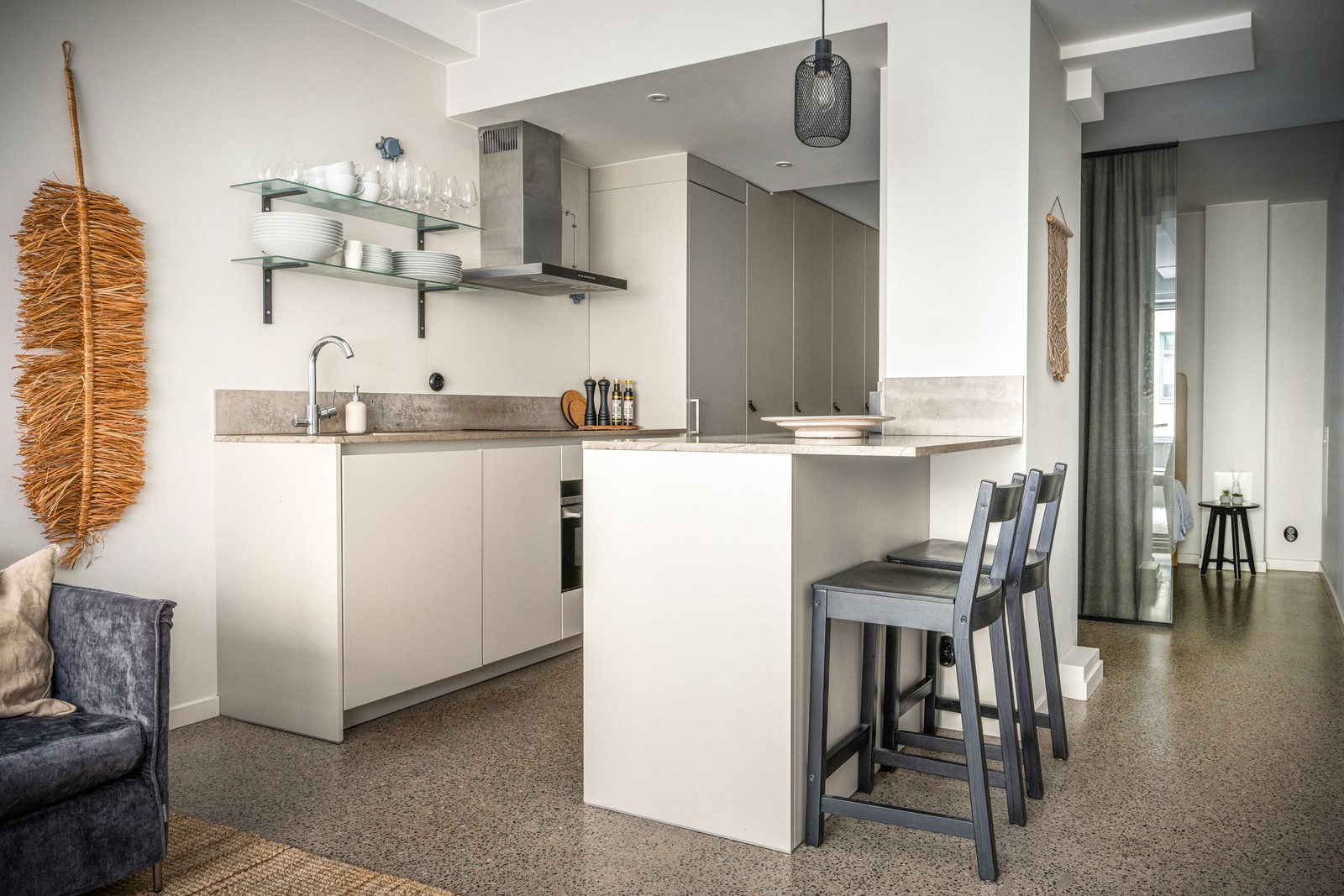 Planlösningen är modern och köket avgränsas från vardagsrummet med en stilren köksö. De många underskåpen erbjuder gott om förvaringsmöjligheter, medan köksbänken och köksön tillsammans ger rikligt med arbetsyta. Här stormtrivs hemmakocken!