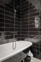 Det första badrummet är inrett i en mörk och elegant ton. Väggarna kläs med svart blankt kakel i rektangulärt format och på golvet ligger ett varmbrunt klinker som ger tyngd och karaktär. Här finns ett fristående badkar, en sandbeige kommod med svarta detaljer samt en rund spegel med LED-belysning. Svarta blandare och beslag återkommer genomgående och skapar en modern känsla. Golvvärme, en svart matt handdukstork samt infällda spotlights i taket bidrar till komforten. Tvättmaskin och torktumlare är smart integrerade under en arbetsbänk i marmormönstrad laminat, med överskåp i samma sandbeige nyans – en praktisk lösning med stil.