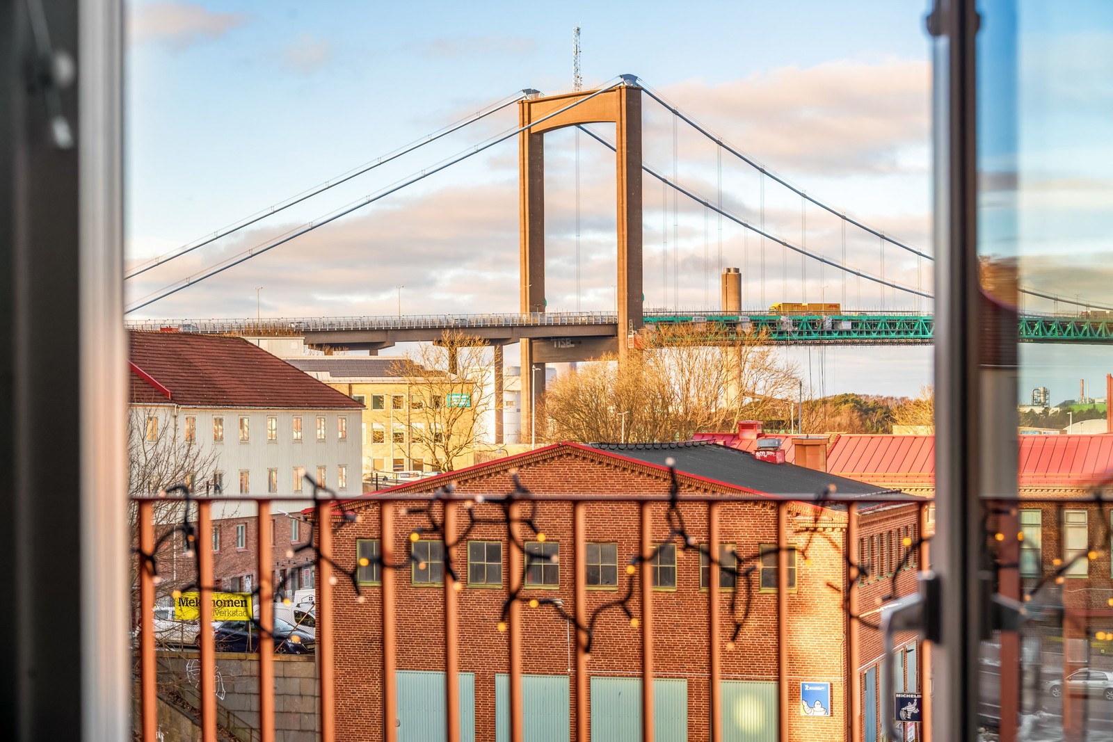 Från vardagsrummet nås balkongen som blir en naturlig förlängning av bostaden. Med sitt höga och fria utsiktsläge bjuder den på en luftig vy över närområdet och Älvsborgsbron och skapar en härlig plats för morgonkaffet, odling eller avkoppling i härlig kvällssol.