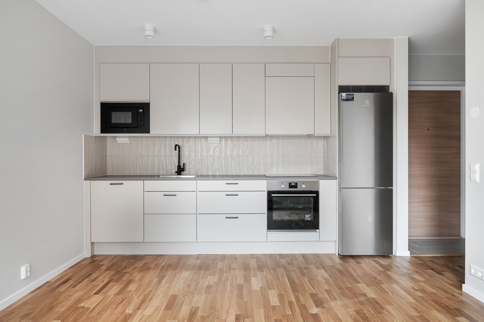 Här är varje detalj genomtänkt. Fönsterbröstningen är låg och skapar en luftig känsla med ljus och utsikt. I kombination med ljusgråa väggar och genomgående ekparkett skapas en hemtrevlig och sober grundpalett. Köksinredningen går i en beige kulör och ovan den tunt eleganta bänkskivan sitter ett stående kakel i beige matchande färg. Beslagen går i kaxigt svart och givetvis erbjuds full maskinpark av god och miljövänlig kvalitet. I en öppen och social planlösning mellan kök och allrum får en sovplats - och soffgrupp med enkelhet plats.