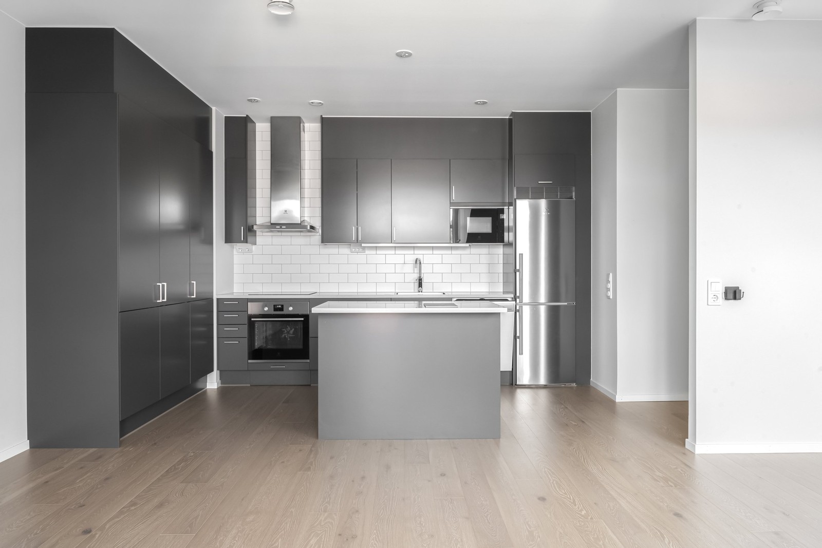 Öppen och social planlösning där kök och vardagsrum flyter ihop till en trivsam helhet. Köket är stilrent inrett i mörkgrå toner med rostfria vitvaror, vita rektangulära kakelplattor och en välplacerad köksö som ger både extra arbetsyta och förvaring. Här finns gott om plats för ett större matbord och i vardagsrummet ryms en generös soffa och övrig möblering. Från vardagsrummet når du den soliga balkongen, och takfönstren bidrar till den ljusa och luftiga känslan.