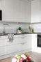 Köket är ett stilrent och funktionellt rum med smakfulla materialval. Bänkskivan i gråsvart kontrasterar snyggt mot det vit- och gråspräckliga stänkskyddet samt de beigegrå skåpsluckorna från Marbodal som är utrustade med både push to open och softclose. Här finns gott om arbetsytor för den matlagningsintresserade, och utrustningen består av rostfria vitvaror från Electrolux inklusive integrerad diskmaskin, svart mikro och ugn samt en modern induktionshäll. Spottar under överskåpen ger både bra arbetsbelysning och ett stämningsfullt sken.
