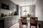 Till höger nås köket, gråa köksluckor kombinerat med en bänkskiva i kvartskomposit, ger en klassisk men modern känsla. Ett matbord för minst fyra personer finns intill fönstret som vetter mot grönska och en trevlig utsikt. Den maskinella utrustningen består av induktionshäll, kolfilterfläkt, varmluftsugn, integrerad diskmaskin, mikrovågsugn samt kyl och frys. Förvaring finns i både över- och underskåp, skafferi och gör köket till en praktisk arbetsyta.
