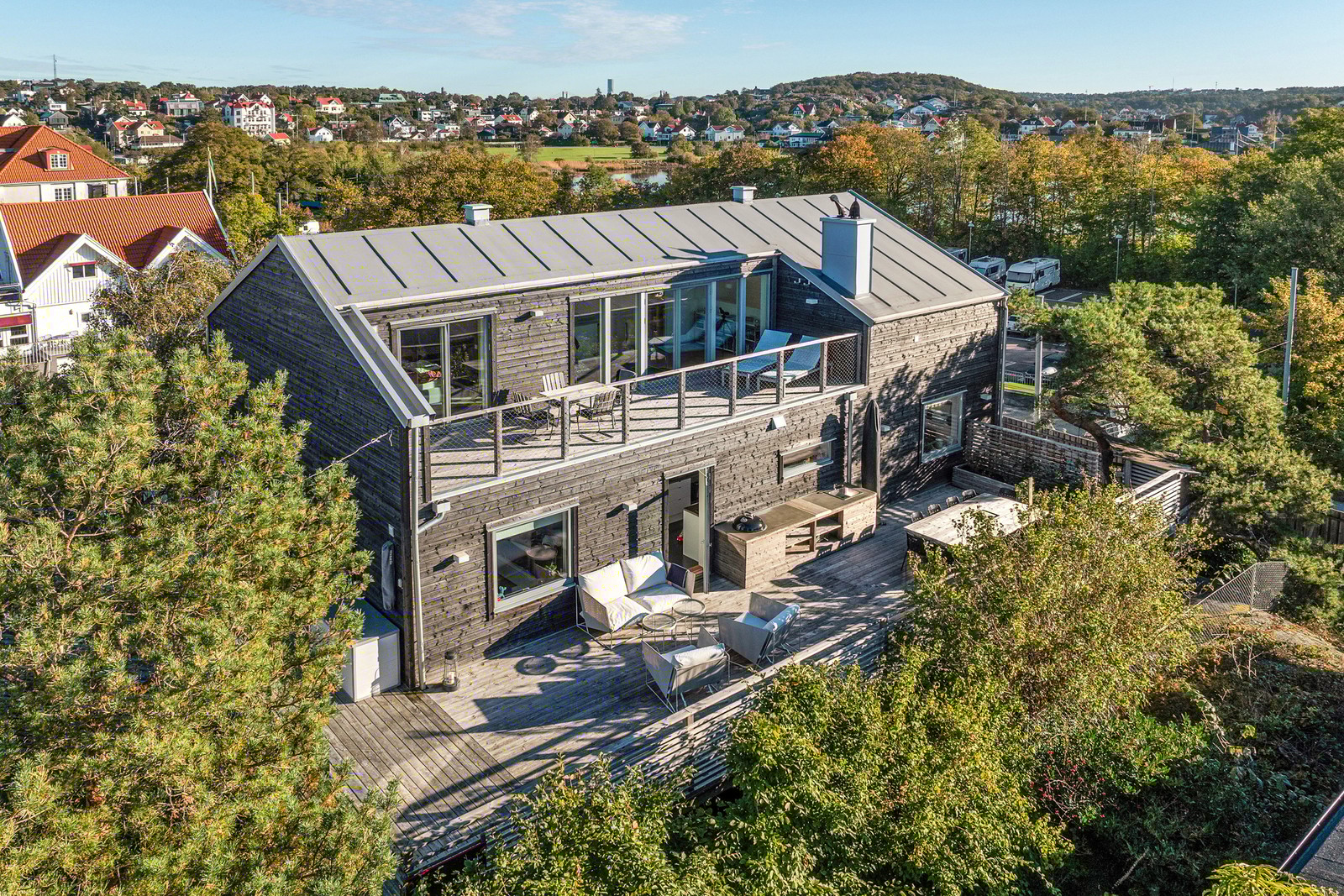 Tidlös arkitektur på högt och privat läge med ljusa ytor, takterrass och fri utsikt över viken