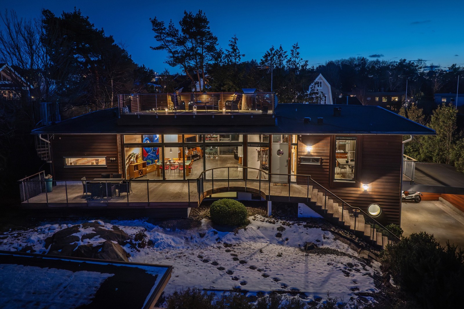 Vågorna slår mot stranden bara ett par hundra meter ner och kvällstid glittrar hundratals ljuspunkter på båda sidor av älven. Uppe på villans skyhöga takterrass är panoramat snudd på 360 grader. Blicken kan löpa från den röda kvällshimlen över Älvsborgs fästning och bort mot de grönskande höjderna i öster. Villan om totalt 300 kvm och sju rum byggdes 2002 i en tidlös modernistisk stil där ljuset från flera håll spelar huvudrollen. Takhöjden stiger svagt och är på sina ställen 3,30 meter. Den ljusa rymden är imponerande. Arkitekturlinjerna har ofta rundade, organiska former vilket – tillsammans med sällskapsytornas magnifika värmegolv i kalksten och inslag av träpanel – samspelar med den omgivande naturens grönska och vatten. Den vitputsade, runda murstocken med dubbla eldstäder är ett stilrent designelement. Utöver sällskapsytorna, med närmast heltäckande glaspartier från Velfac med utgång till terrasserna, har entréplanet ett exklusivt utrustat kök i etage samt totalt fyra sovrum med ekparkett, gäst-wc samt badrum. Sluttningsplanet har två allrum, sovrum, sober relax med bastu, bubbelbad och dusch, flera förrådsytor, tvättstuga, teknikrum samt utgång till carporten med plats för två bilar. Utöver entrésidans kalkstensterrass och den skyhöga takterrassen överraskar villan med en nedsänkt och helt skyddad träterrass på baksidan. Mellan klippor, lövträdsgrönska och fasad ligger här en helt privat plats där kvällssolen faller in. En stjärnklar natt stiger ångan från det stora spabadets varma vatten. Läget i fridfulla kvarter nära stad, hamn, natur och vatten.