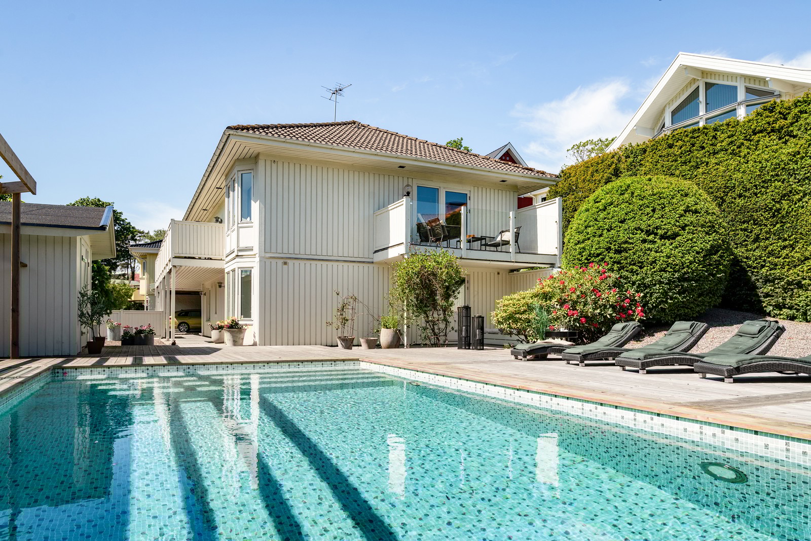 Välskött villa med pool, stora terrasser, bra planlösning och havsutsikt i hjärtat av Långedrag.