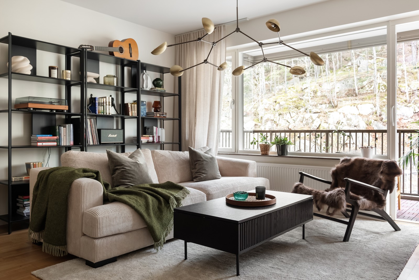 Vardagsrummet ligger i öppen anslutning till köket och är generöst i storlek med plats för soffgrupp med tillhörande möblemang vilket ger en social och rymlig känsla. Sällskapsytorna förlängs av utgången till balkongen som är bostadens höjdpunkt. Den är enorm i storlek och inglasad vilket gör att den kan nyttjas maximalt i olika säsonger och väder.