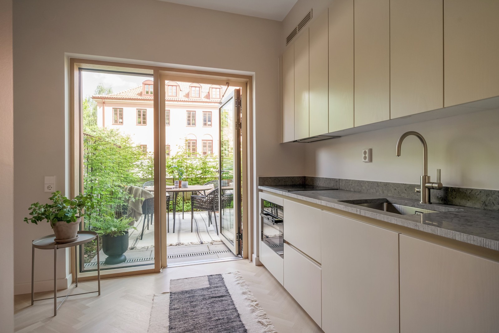 När ni närmar er huset möts ni av en imponerande entrédörr och en foajé med granitgolv och en välvd vägg målad i Stucco lustro. Det är svårt att förstå att huset är nybyggt innan man kommer in i själva bostaden. Hela bostaden har mattlackad parkett med fiskbensläggning som löper genom hall, kök, vardagsrum och sovalkov. Smakfullt kök från Kvänum med bänkskiva i kalksten från Kinnekulle som återkommer i det påkostade badrummet. I badrummet finns även en kombinerad tvättmaskin och torktumlare. Från vardagsrummet nås en stor uteplats där ni kan njuta av de lugna och pittoreska omgivningarna och blicka ner mot Näckrosdammens grönska. Här har ni verkligen en privat oas endast minuter från händelsernas centrum. På baksidan av huset äger föreningen en generös skogstomt. Härifrån tar du enkelt baksidans entré om du vill röra dig mot Johanneberg.