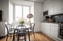 Vidare in i bostaden möts du av kök, vardagsrum och sovrum i en öppen och inbjudande planlösning. Väggarna är bredspacklade och målade i brutet vitt. Köket ligger öppet och syns från både hall och sovdel. Det är tidlöst vitt med skåpinredning och överskåp från HTH. Fullutrustat kök med maskinpark från 2014 beståendes av vitvaror från välrenommerade Siemens. Här erbjuds en integrerad diskmaskin som underlättar vardagen, induktionshäll, ugn med varmluftsfunktion, mikro, kombinerad kyl/frys och goda förvaringsmöjligheter.