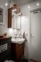 Badrummet är väl tilltaget och smakfullt renoverat i klassiska färger, utrustat med takdusch, spegelskåp och kommod från Hafa, wc och spotlights.