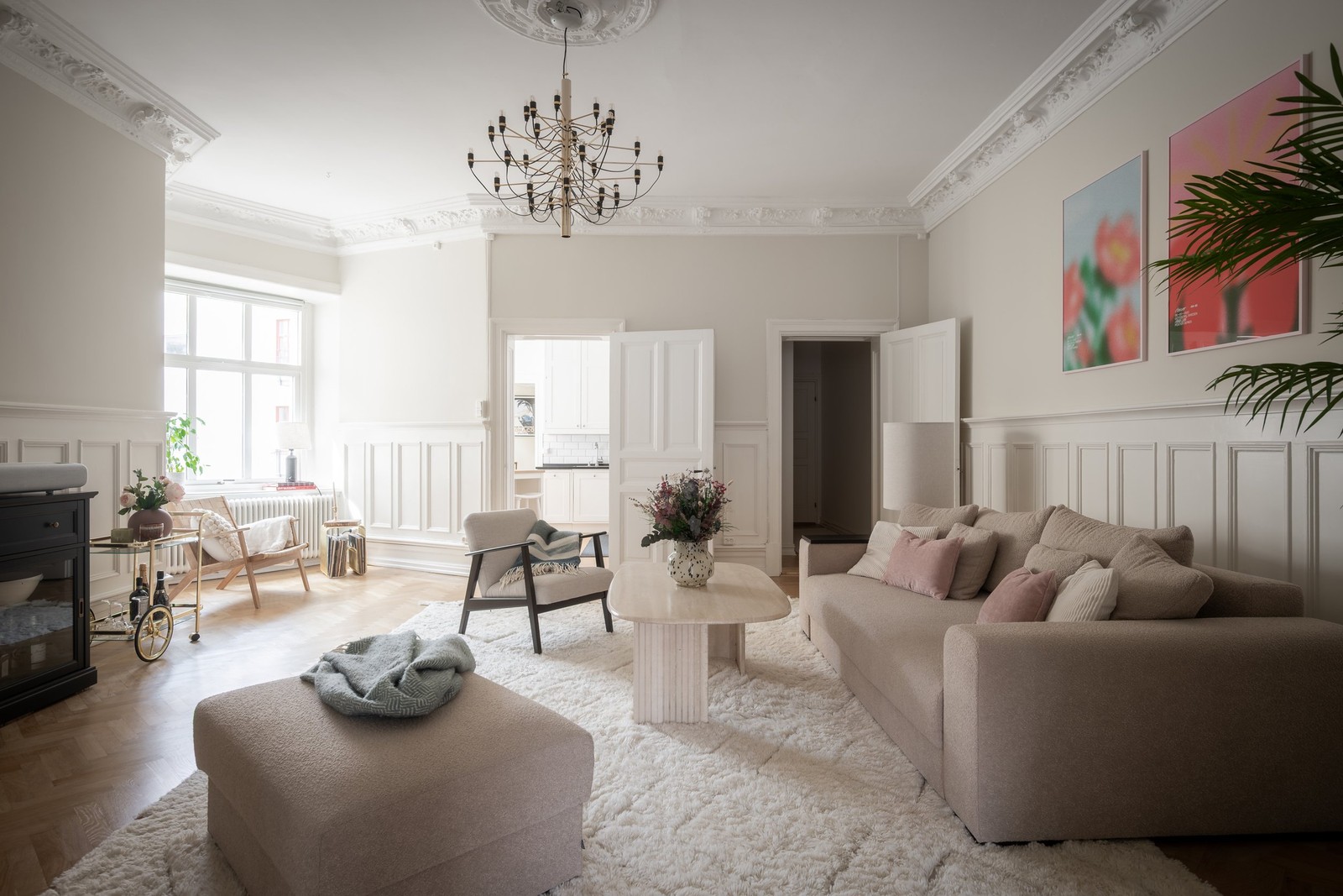 Elegant sekelskiftesvåning högt över Linnégatans grönska.