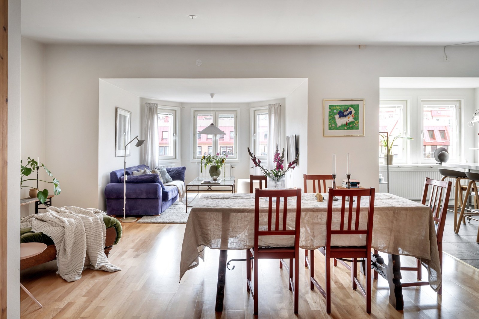 Trivsamt boende med utsikt över grönskande Linnégatan. Ljust burspråk, sociala ytor och ett stilrent Kvänum-kök skapar ett hem att trivas i.
