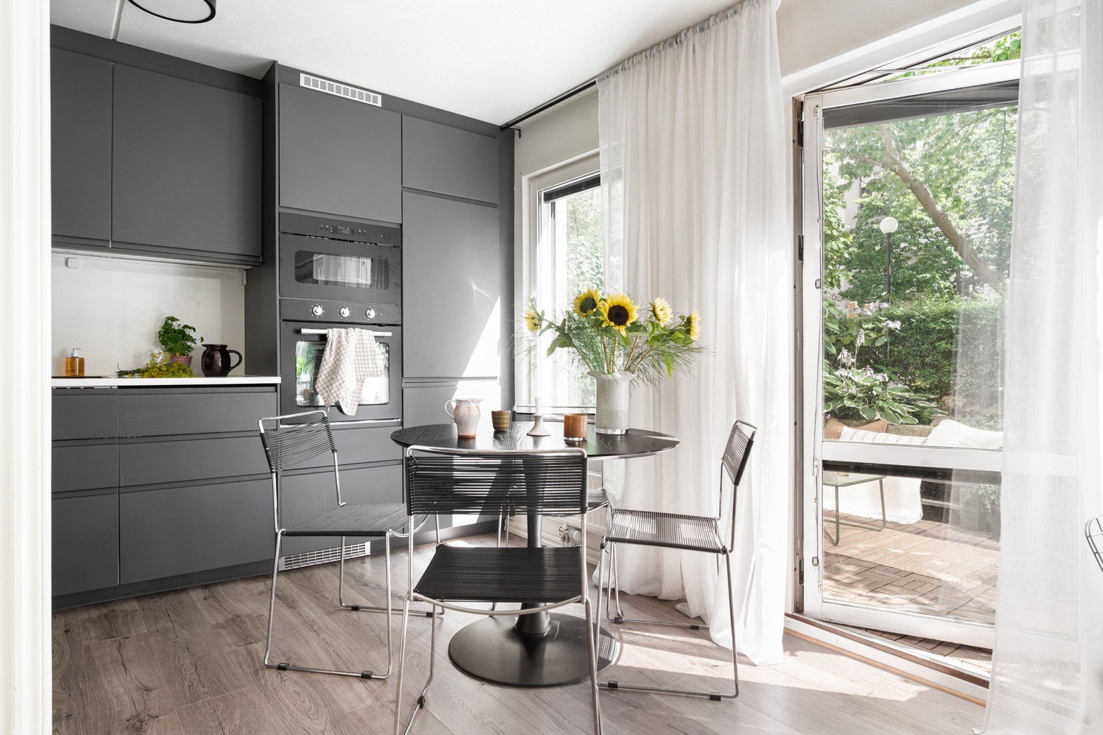 Det stilfulla och praktiska Ikeaköket är nytt från 2021. Grå inredning bryts smakfullt av mot den ljusa bänkskivan. Här finns gott om plats för både bänkyta och förvaring. Full maskinpark med kyl/frys, ugn, micro, diskmaskin och en nyligen installerad spishäll (2023).