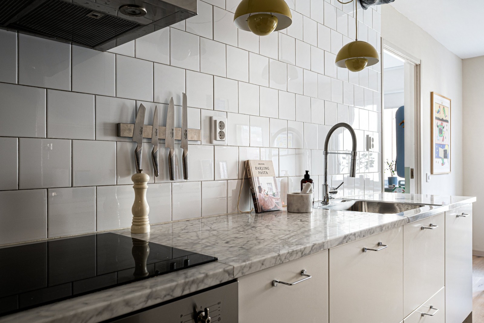 Köket ligger till vänster om hallen. Bakom de vita skåpsluckorna finns gott om förvaring. Arbetsbänk i marmor. Utrustningen består av kyl och frys i fullhöjd, häll, ugn, diskmaskin och fläkt.