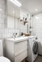 Från hallen nås det fint renoverade badrummet. Stilrena materialval, ljusgrått klinker på golvet och vita kakelplattor på väggarna. Inredningen består av badkar, handfat med kommod, spegelskåp, handdukstork, golvvärme och kombinerad tvättmaskin/torktumlare.