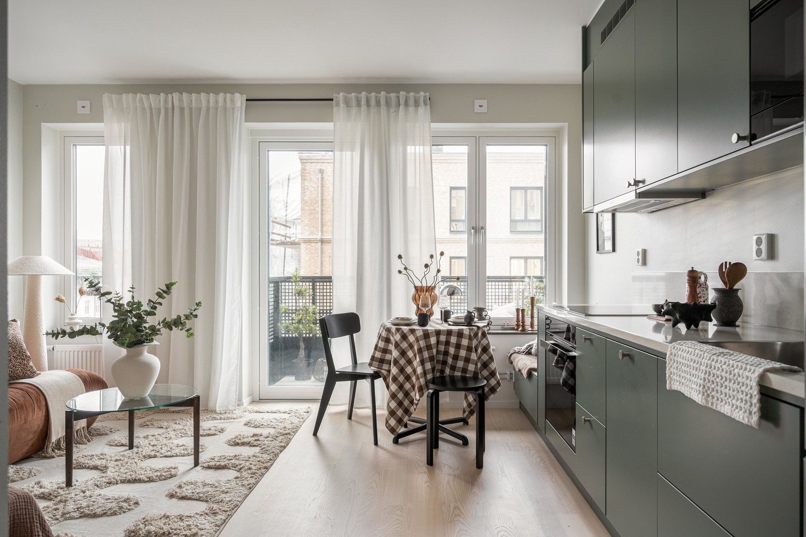 Ljust och luftigt rum med öppen planlösning som skapar en social och trivsam känsla. Här ryms både soffa, matplats och säng utan att rummet känns trångt. De stora fönstren släpper in rikligt med dagsljus och ger en harmonisk atmosfär. Direkt utgång till balkongen i västläge.