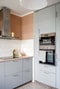 Den smakfulla köksinredningen är i grå och ovanför bänkskivan i askmönstrad laminat sitter vitt kakel. Väggarna i färgen peachy gifter sig väl. Den maskinella utrustningen består av induktionshäll, varmluftsugn, diskmaskin, mikrovågsugn samt kyl/frys. Det finns gott med förvaringsutrymme i både vägg- och bänkskåp. Matplatsen rymmer cirka 4 personer. På golvet ligger eklaminat.